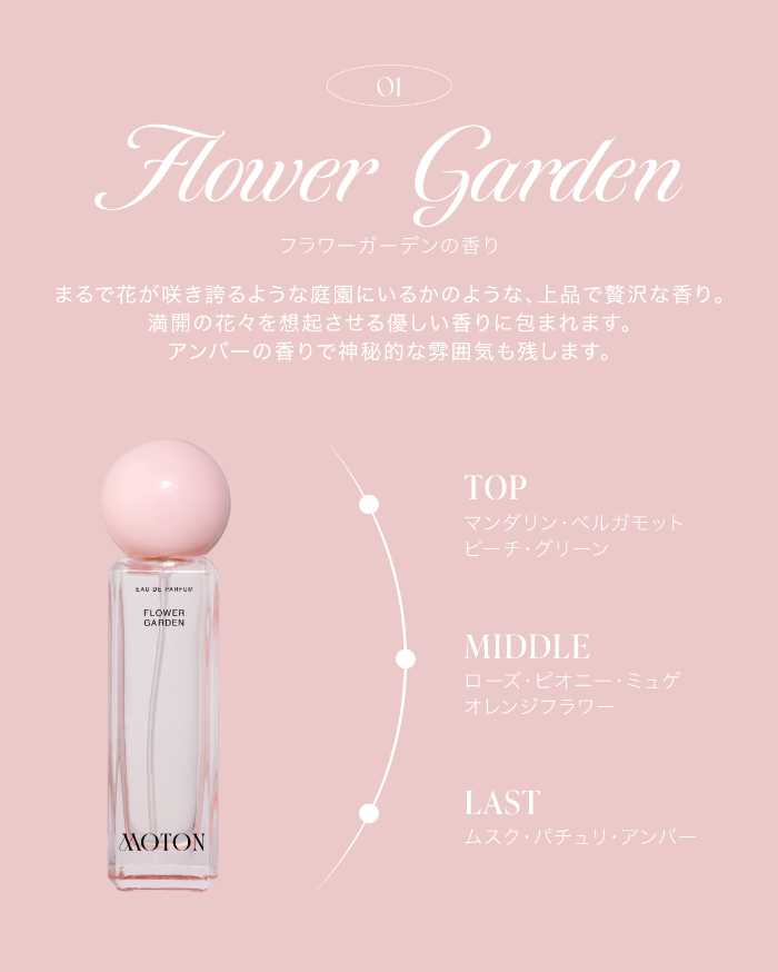 FLOWER GARDENは、みずみずしいマンダリンやベルガモット、ローズやピオニーが華やかに重なり、大きな花束を抱きしめたような幸福感に包まれる香り。