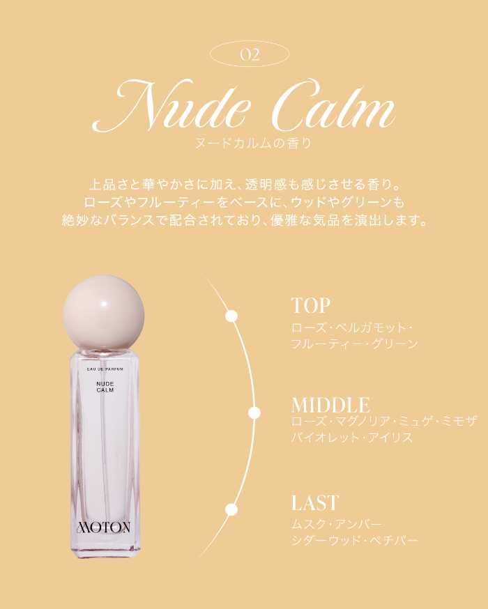 NUDE CALMは、ローズやマグノリアに透明感のあるミュゲやアイリスが重なり、気品あふれるフルーティーフローラル。