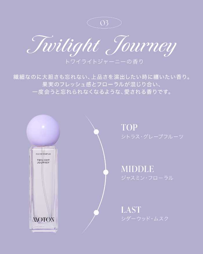 TWILIGHT JOURNEYは、爽やかなシトラスとジャスミンが織り成す華やかさと、ラストのムスクとシダーウッドが印象的に残る贅沢なフレグランスです。