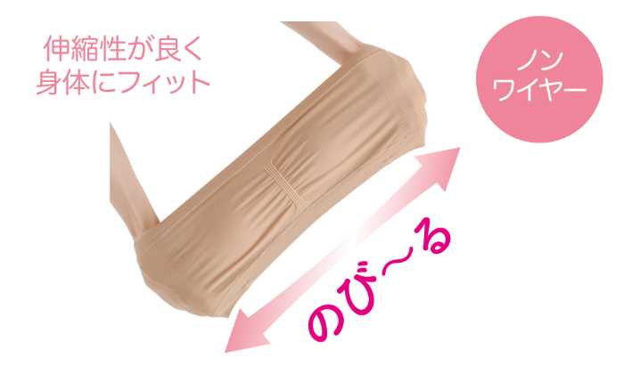 「快適ゆる楽チューブブラ」は、パッド全面に通気穴があるエアースルーパッドを採用。風通しが良く、長時間つけてもムレにくい快適な着け心地です。
