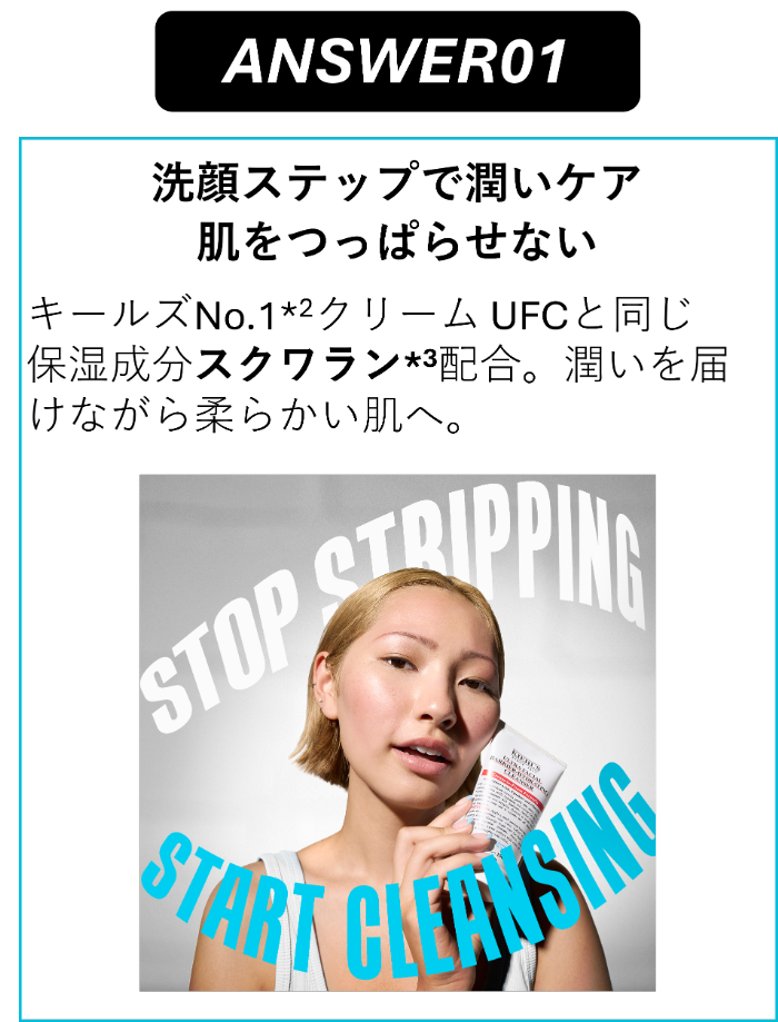 「キールズ モイストクレンザー UFC」は、石鹸成分を使わないソープフリー処方。スクワラン³などの保湿成分を配合し、洗顔後のつっぱり感を防ぎます。