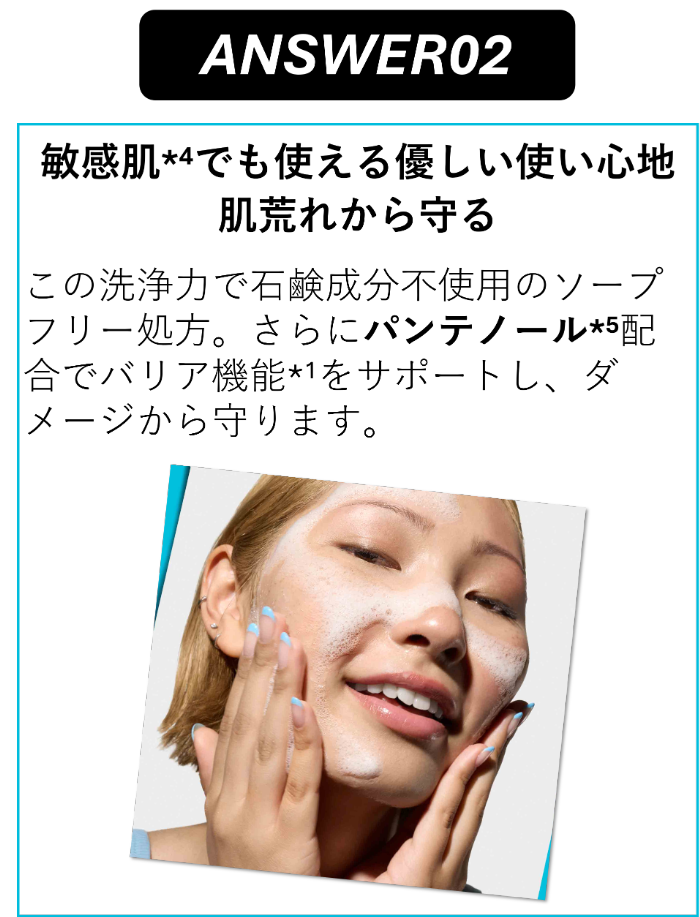 保湿成分1でつっぱらず、余分な皮脂をしっかりオフ。さらに角質層²のバリアをサポートして、肌荒れを防ぎます。毎日の洗顔が、保湿ケアと肌コンディション向上の一歩になります。