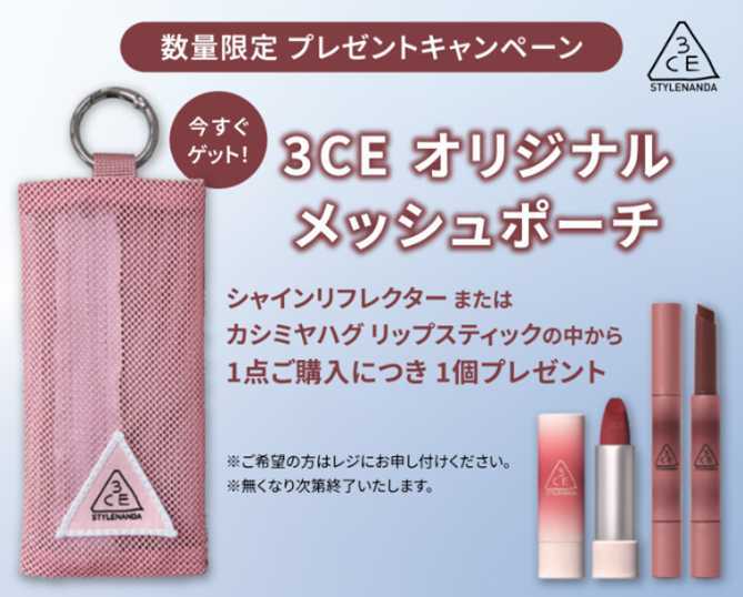 一部店舗限定で「シャインリフレクター」または「カシミヤハグ リップスティック」を購入すると、数量限定の3CEオリジナルメッシュポーチをプレゼント。