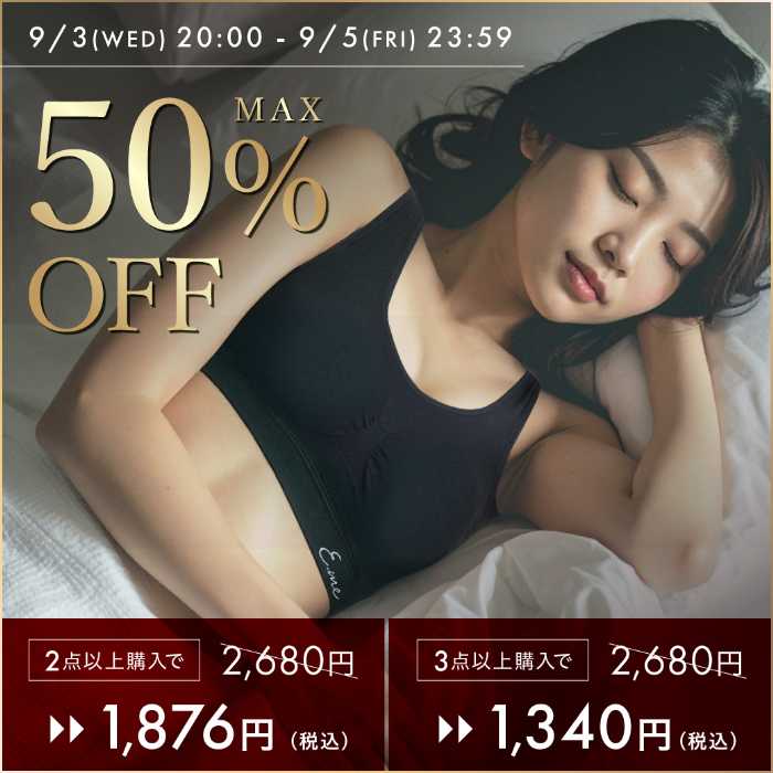 9月3日20時からスタートする楽天スーパーSALEでは、「E.meナイトブラ」が【50%OFF★2,680円→1,340円】で登場します。数量限定のため、気になっていた方には絶好の機会。