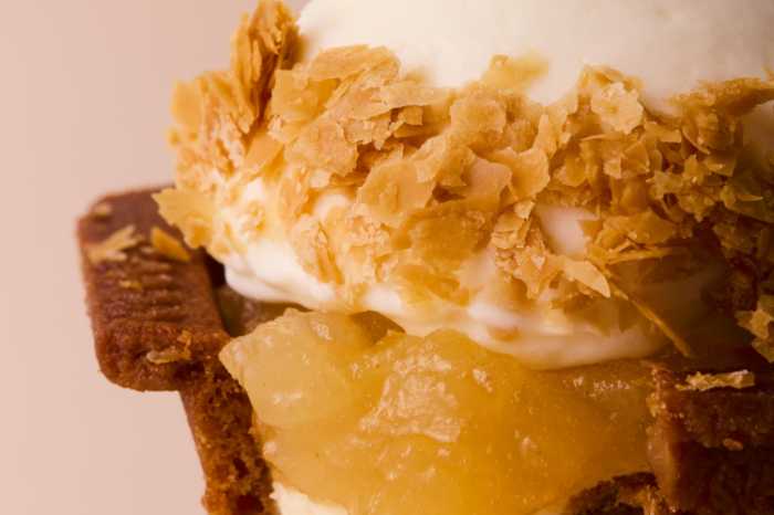 国産りんごのプレザーブと自家製パイが生み出す重層的な味わいは、秋ならではの特別感♡ 冷凍・半解凍・全解凍で変化する食感も楽しめます。