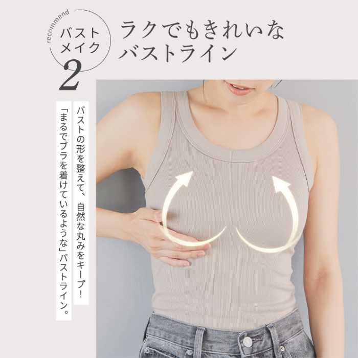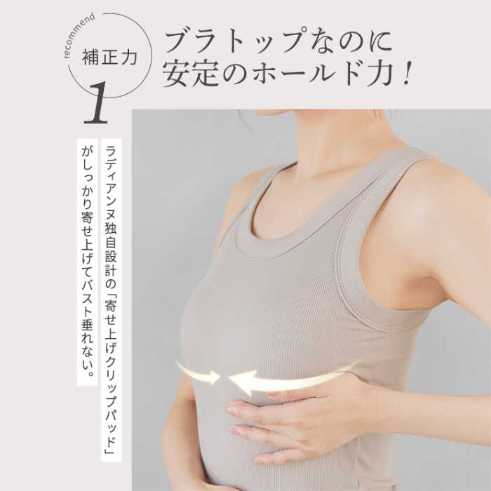ラディアンヌの「オールインワンブラトップ リブフィットタンク/キャミソール」は、バストをしっかり寄せ上げるクリップパッド付き。