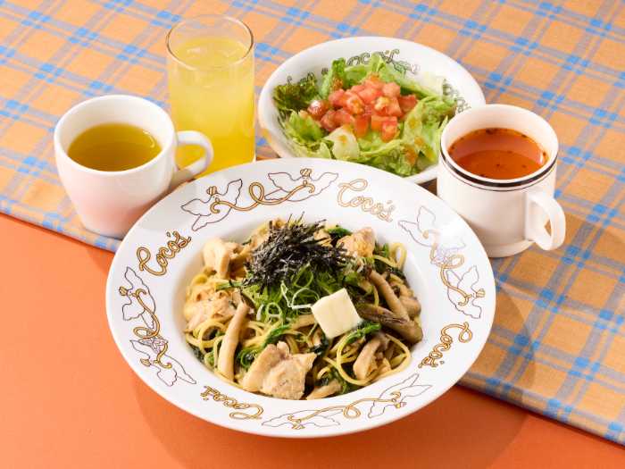 「パスタランチセット」では、舞茸やしめじ、チキン、ほうれん草を合わせた《チキンときのこのバター醤油パスタランチ》(890円/税込979円)が登場。