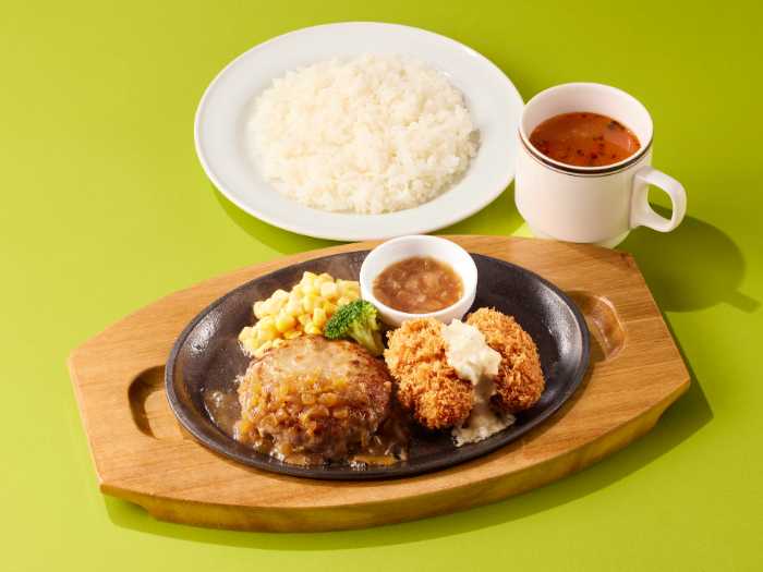大ぶりの牡蠣フライにタルタルソースを添え、合挽きハンバーグにはジャポネギソースを別添え。満足感たっぷりの一品です。