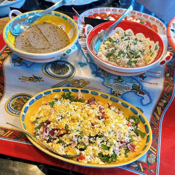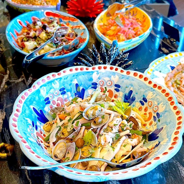 彩り豊かなヴィエトリ陶器に盛られた料理は、味わいだけでなく見た目にも華やか。イタリアらしい活気あふれるテーブルが、特別なひとときを演出します。