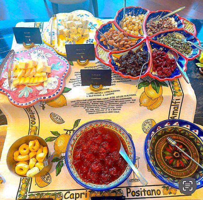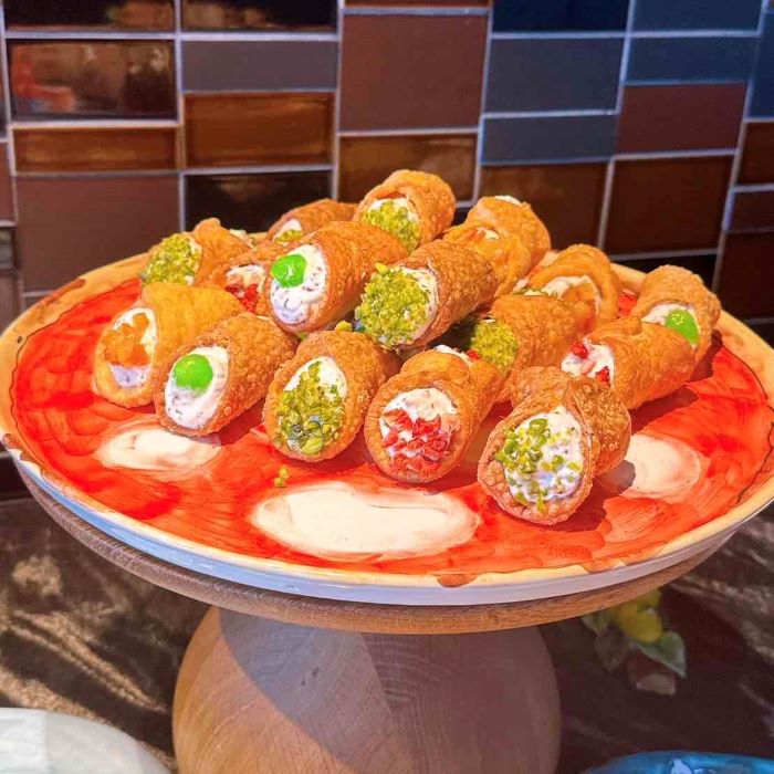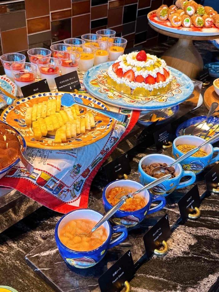 スイーツ台には、ズコットやカンノーリをはじめ、パンナコッタやフルーツのトッピングまで彩り豊かに並びます。イタリアらしい華やかなドルチェ文化を堪能できる空間は、見ているだけで心が躍るほど。甘さや彩りのバリエーションも豊富です。