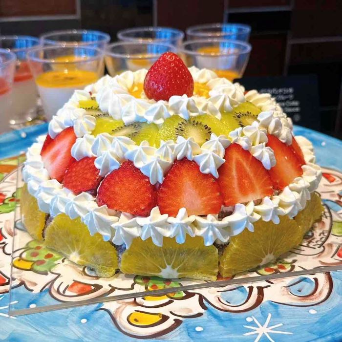 苺・キウイ・オレンジをたっぷり飾ったケーキ。中には濃厚なチョコレートケーキが隠れており、フルーツの爽やかさとチョコのコクが美味しいです。