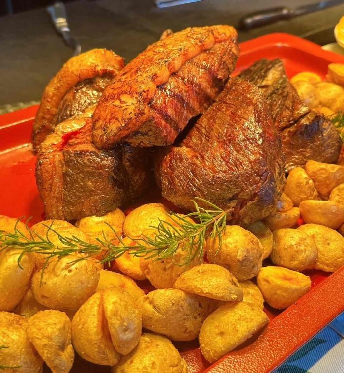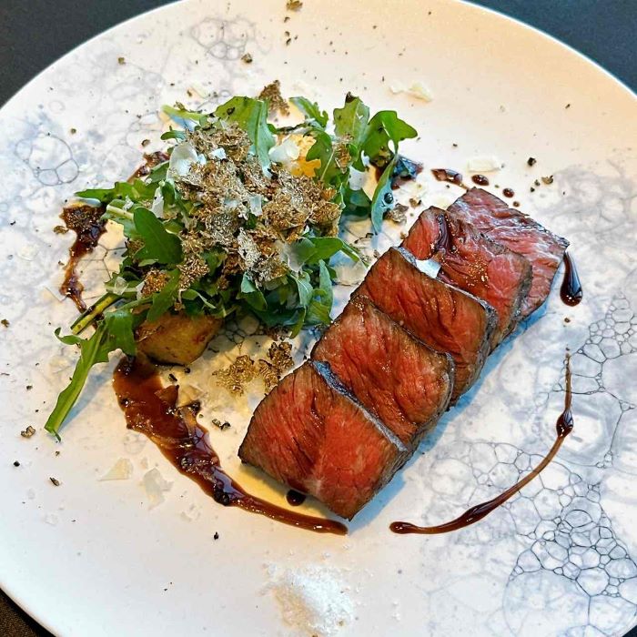 ディナーではライブキッチンで仕上げられたタリアータが登場。大きなブロック肉を目の前で切り分ける迫力と香りに食欲をそそられます。マルサラソースが肉の旨みを引き立て、ローストポテトとともに贅沢なひとときを演出します。