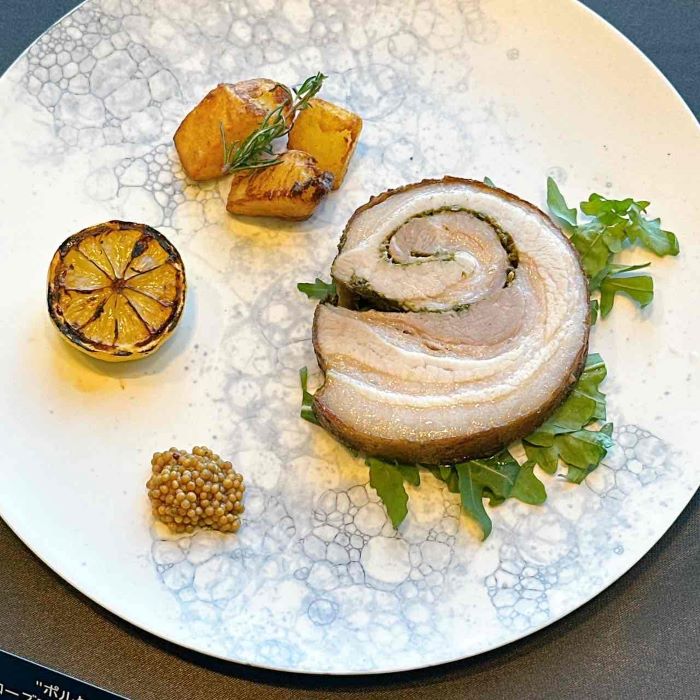 ディナーではライブキッチンで豪快に焼き上げたポルケッタが登場。こんがりとした皮の香ばしさとジューシーな肉の対比が印象的です。ハーブとにんにくの香りが食欲を誘い、切り分けられる瞬間から特別感に包まれる一品です。
