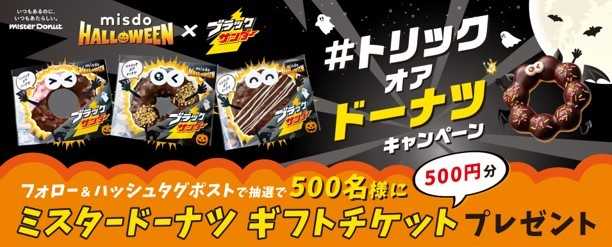 「#トリックオアドーナツキャンペーン」では、公式Xをフォロー&指定ハッシュタグで投稿すると、抽選で500名様にミスタードーナツギフトチケット(500円分)が当たります。