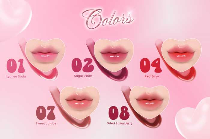 カラー:01 Lychee Soda(Pink Shade)/02 Sugar Plum(Violet Shade)/04 Red Envy(Orange Shade)/07 Sweet Jujube(Brown Shade)/08 Dried Strawberry(Red Shade)