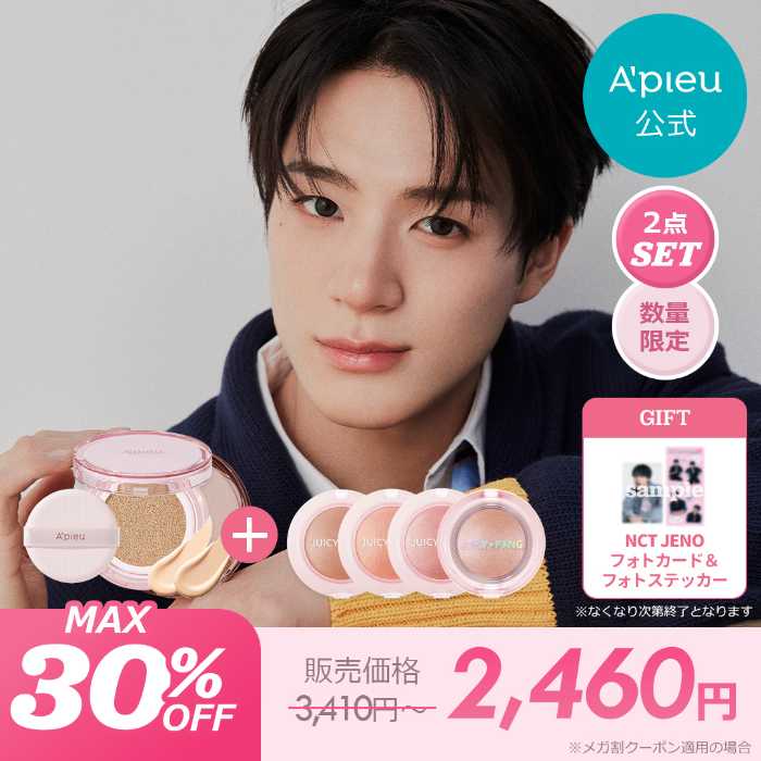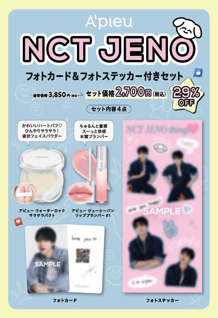 NCT JENOのフォトカード&ステッカーが付いたA’pieuの数量限定セットは、推し活とメイクを同時に楽しめる特別なアイテム。