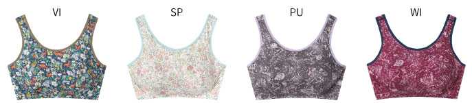 夜用インナーとして人気の《ナイトアップブラ》からもリバティ柄が登場。品番JB3950、サイズM~3L、カラーVI/SP/PU/WI、価格3,300円(税込)。
