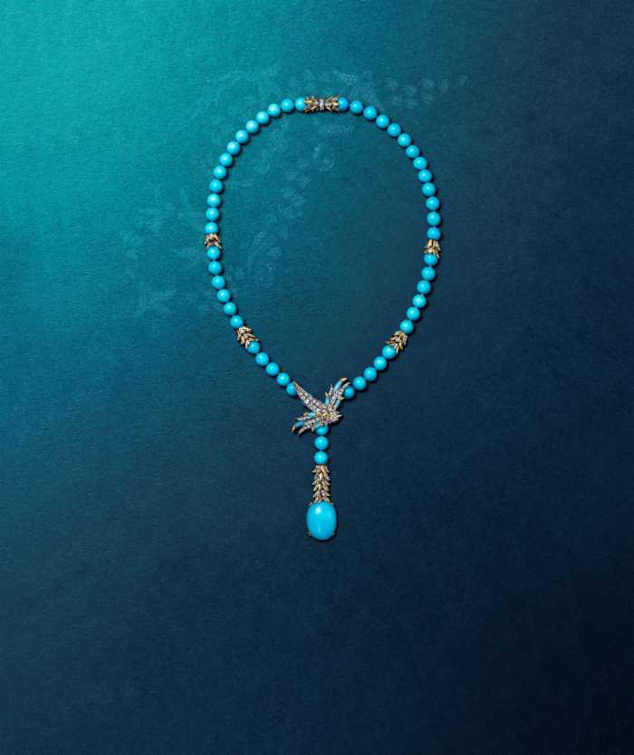 カボションカットのターコイズが連なるネックレスに、ゴールドとダイヤモンドの羽根がアクセントを添え、ペンダント、ブローチ、リングまで幅広く展開。シュランバージェへのオマージュを込めた独創的なピースです。