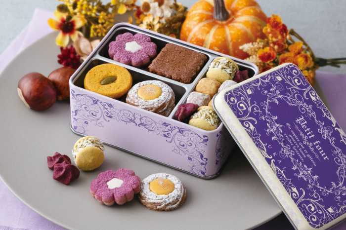 「フールセック・ハロウィン小缶」(税込3,340円)は、紫芋や南瓜のやさしい甘みと、カカオやバターが織りなす深い風味を楽しめる8種のクッキーの詰め合わせ。