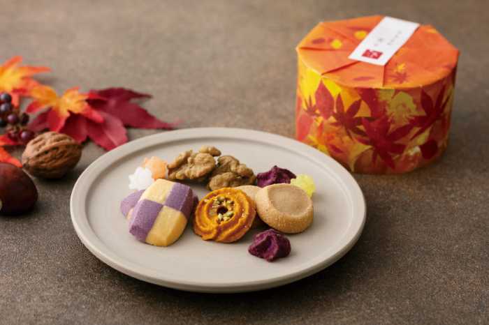 京都と大阪の店舗限定で販売される「秋の紋様缶」(税込3,450円)は、胡麻やお茶、果実の風味をいかしたクッキーに加え、紫芋や南瓜などの秋限定の味わいを詰め合わせた贅沢な一缶。