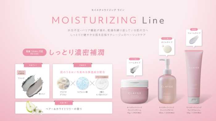 モイスチャライジングは乾燥や毛穴ケアに最適で、クレンジングバーム1,760円(税込)、クレンジングオイル1,650円(税込)、フェイスウォッシュ1,100円(税込)を展開。
