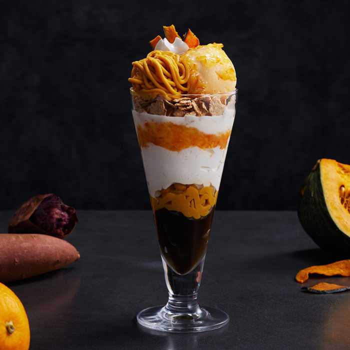 『かぼちゃのモンブランパフェ』(¥1,490税込)は、えびすかぼちゃのクリームに、自家製ほうじ茶ゼリーやソフトクリームを重ね、バニラアイスや瀬戸内オレンジソースをトッピングした贅沢な一品。