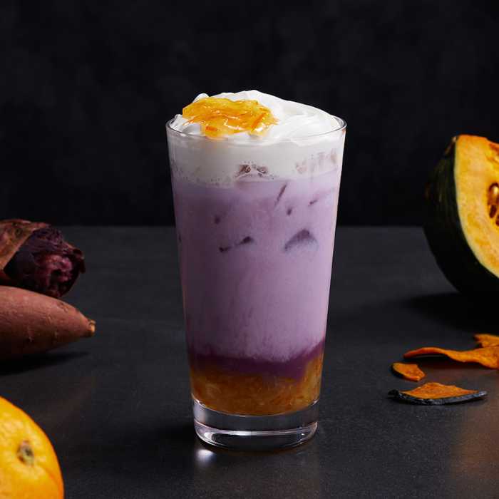 昨年人気の「紫いもラテ」がさらに進化。『紫いもスイートラテ』(HOT/ICED 各¥730税込)は、鮮やかな紫いもあんにミルクを合わせ、そこへ瀬戸内オレンジソースを加えた新感覚ドリンク。