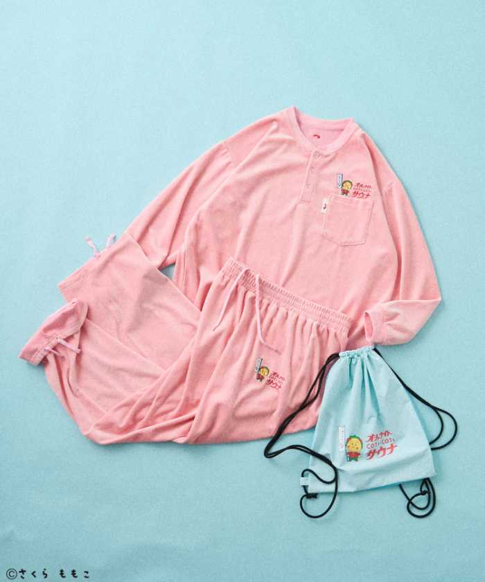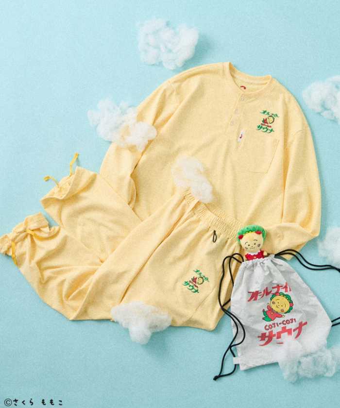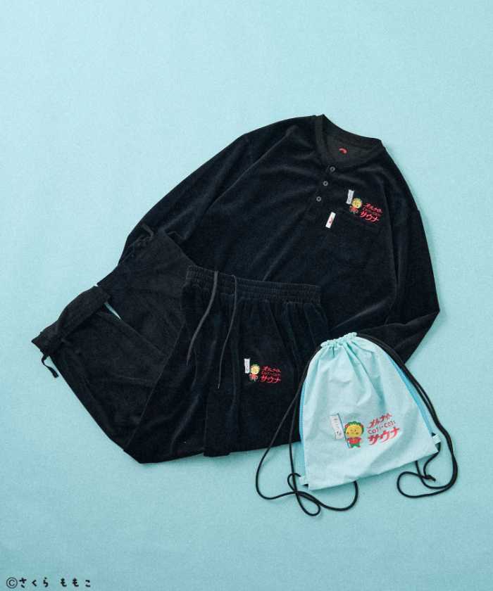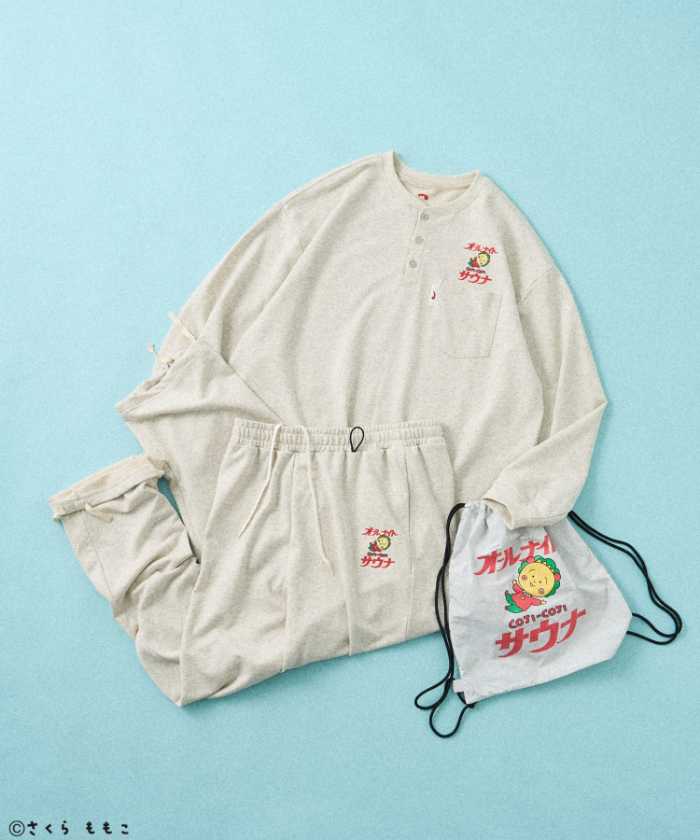 館内着をイメージした「KANNAIGI×COJI-COJI裏毛L/S」(¥7,700 tax in)はサウナ後に心地よく着られるセットアップ。