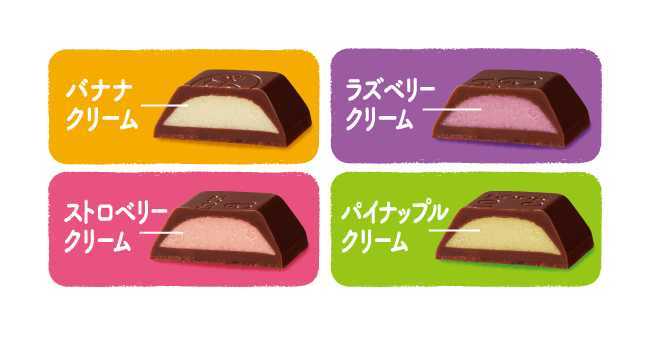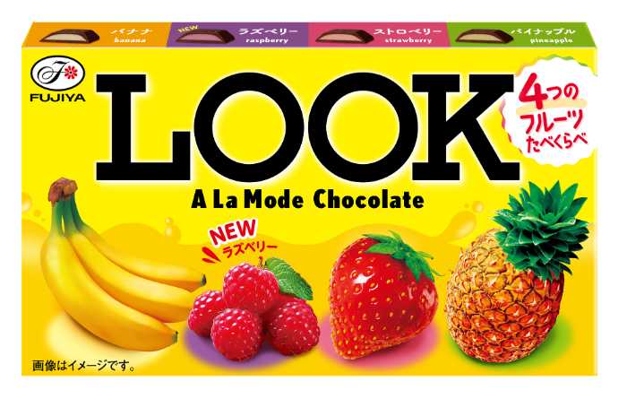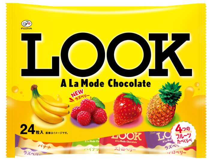 「ルック(ア・ラ・モード)」12粒入り、オープンプライスは9月9日全国発売。バナナ、ストロベリー、パイナップルに加え、ラズベリー味が加わりました。