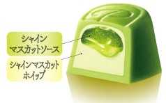 シャインマスカットパウチ41g(オープンプライス)は、ジューシーな果汁とホイップをチョコで閉じ込め、まるでボンボンショコラのような味わいを楽しめます。
