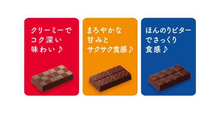 ミルクパレードは43g(9枚)、ホワイトラバーズも43g(9枚)で、クリーミー・フィアンティーヌ・クッキークランチの3種をアソート。