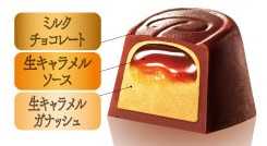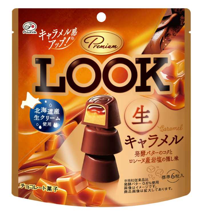 素材にこだわった「プレミアムルック」シリーズも新登場。生キャラメルパウチ44g(オープンプライス)は、とろける生キャラメルソースとガナッシュをミルクチョコで包んだ贅沢仕様。