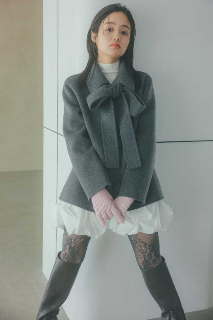 リバーステンカラーJK ¥24,970はビッグリボン付きの2WAYデザインで、ショート丈ながらキレイめにもカジュアルにも対応。