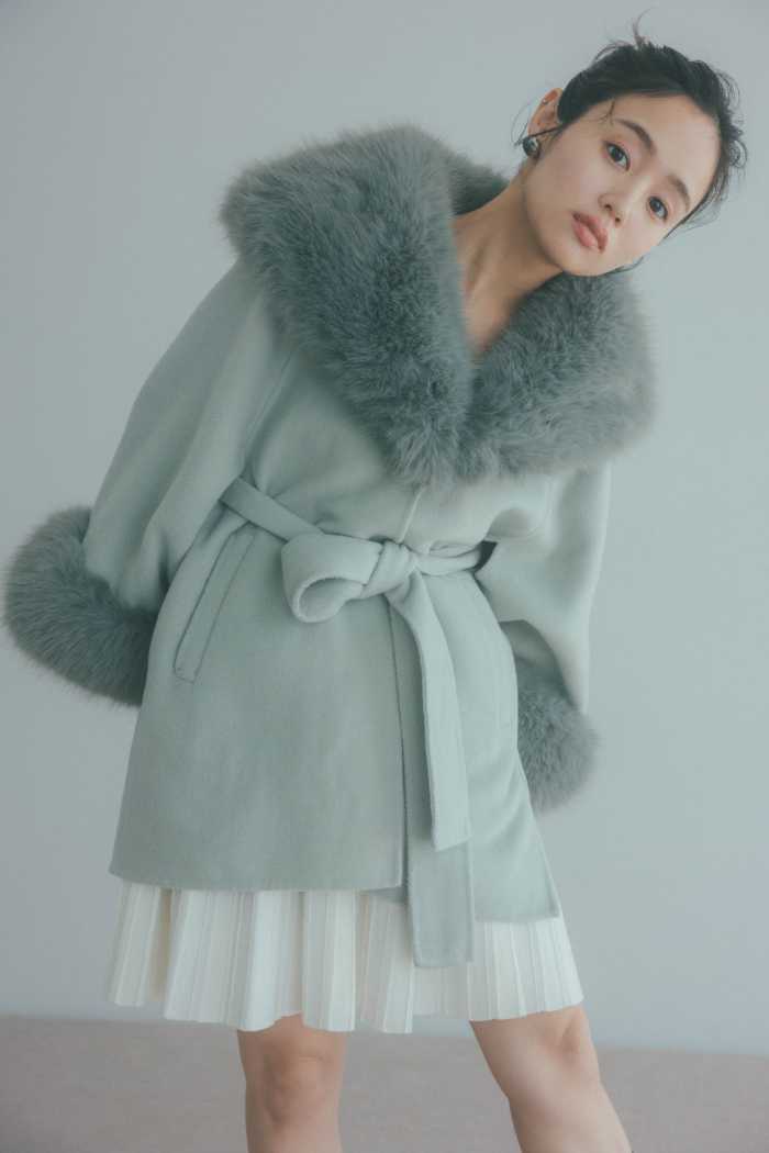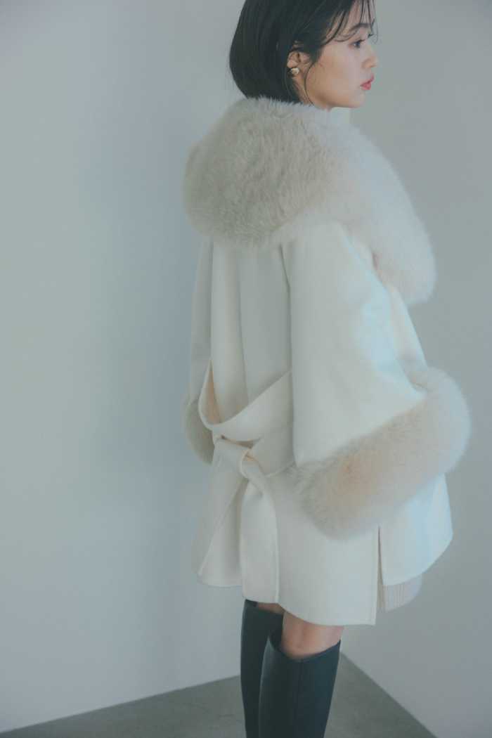 ファーケープコート ¥38,940は顔周りを華やかに演出するボリュームファーが魅力です。
