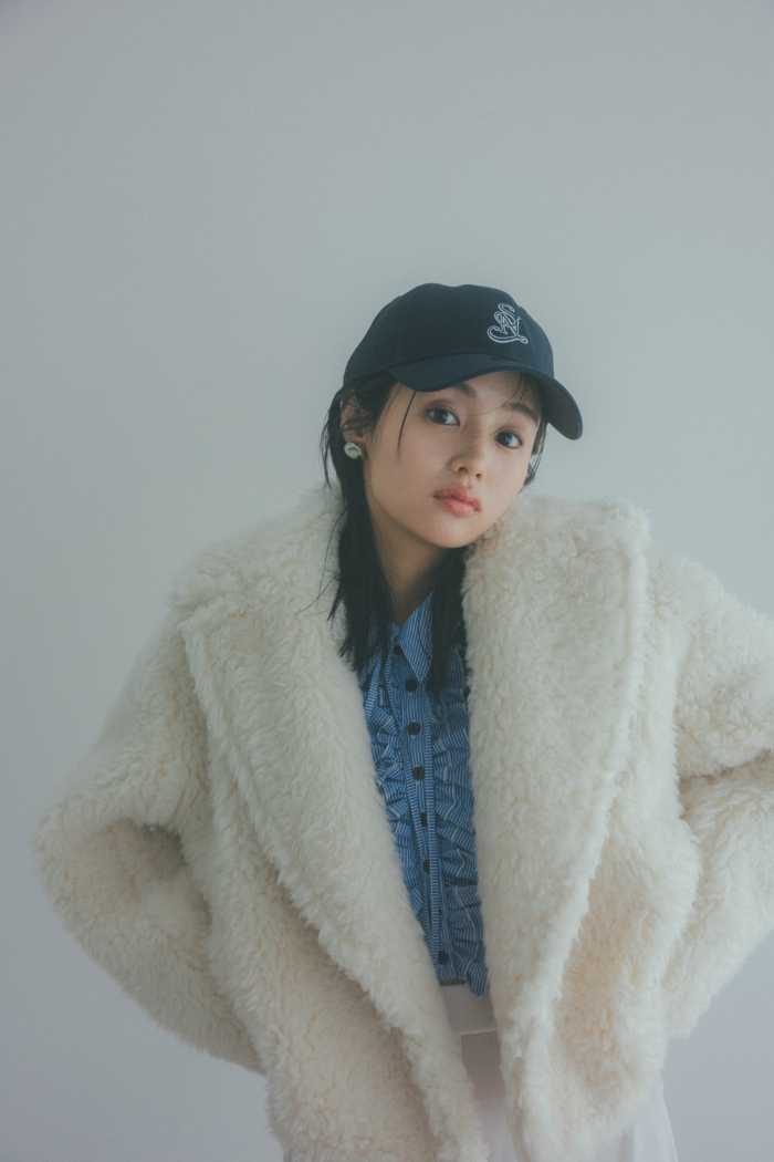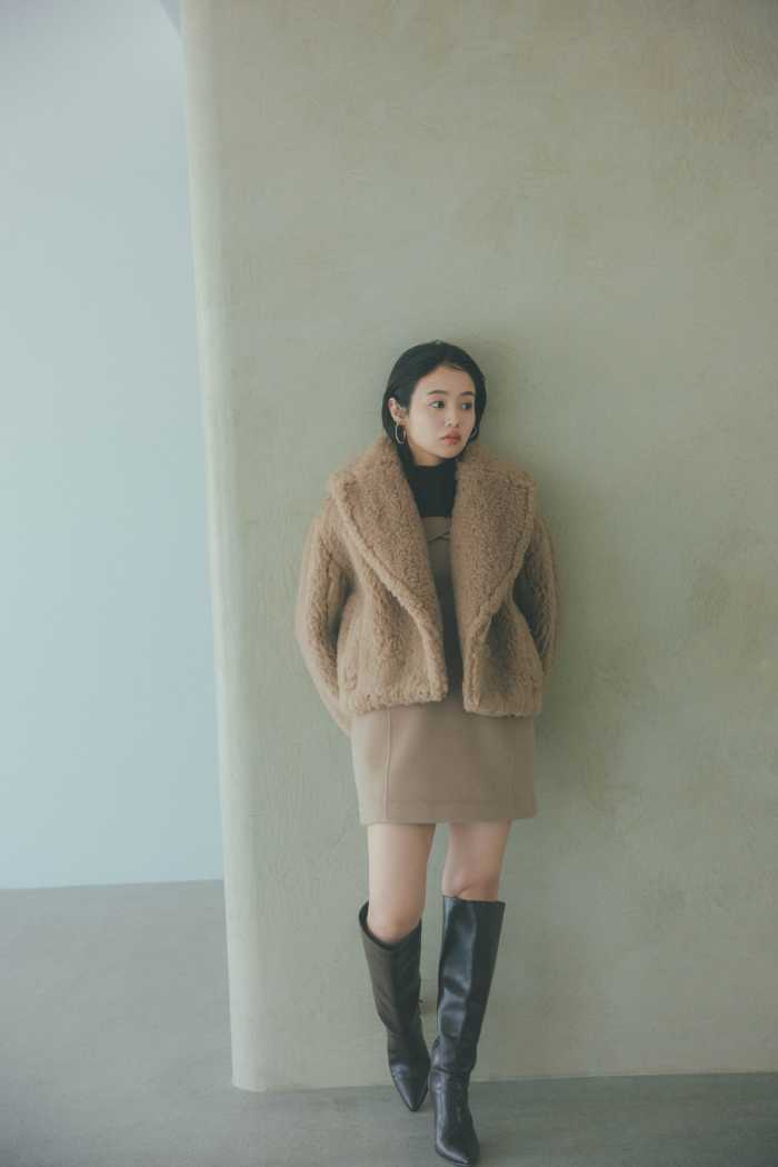 ボアショートコート ¥27,500は、ふわふわのフェイクファー素材を使用し、軽量ながらリッチな起毛感が特徴。