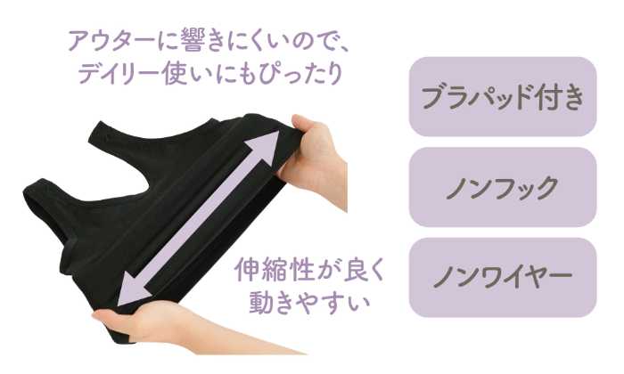 左右一体型パッドが横流れを防ぎ、丸みある美バストをキープ。ノンフック・ノンワイヤー仕様で締め付けを感じにくく、長時間の着用も快適です。