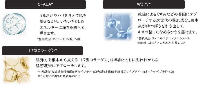 本製品には、整肌成分アミノレブリン酸リン酸(5-ALA1)、ハリ成分W3772をはじめ、輝くツヤのための6種類のビタミン3、さらに8Dヒアルロン酸4を贅沢に配合。