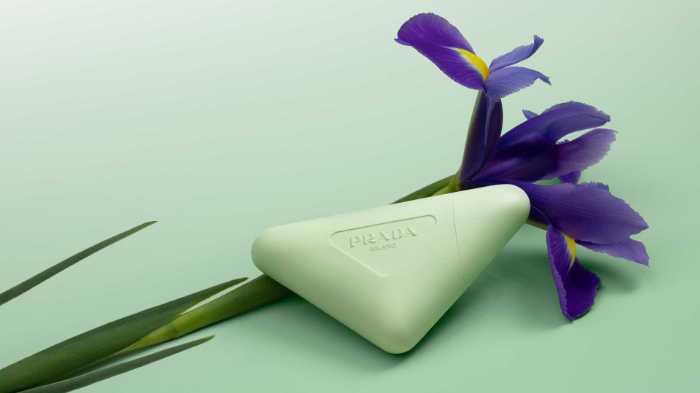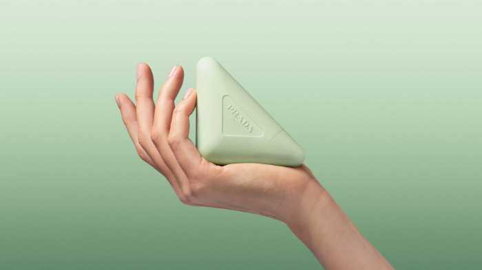 プラダトライアングルをあしらった美しいパッケージは、手のひらにフィットする形状。