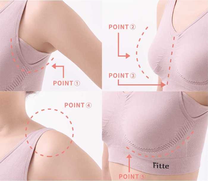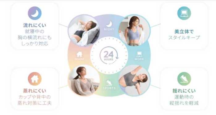立体成型で部位ごとに編地を変化させ、就寝中の横流れを防止。パッドで自然な立体感をつくり、前中心の固定で左右の広がりを軽減します。