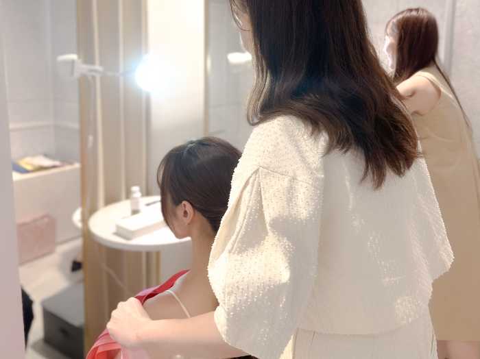 ピンクベージュを基調にした洗練された店内で、ルームウェアやブラ&ショーツを実際に試着。肌触りや機能性、サイズ感を確認でき、多くのお客様から「品質が想像以上に良い」と高評価をいただきました。