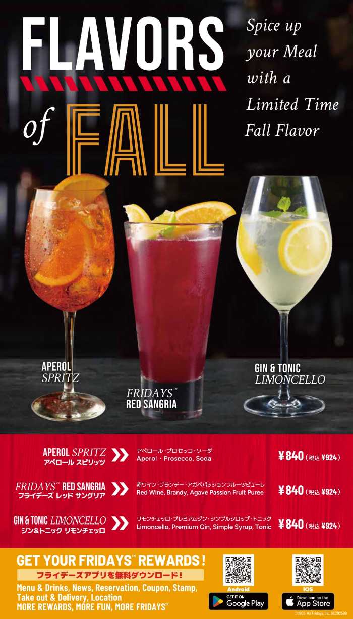 スパークリングが爽やかな「アペロールスピリッツ」(税込¥924)、フルーティーな「フライデーズレッドサングリア」(税込¥924)、大人の余韻が残る「ジン&トニック リモンチェッロ」(税込¥924)。