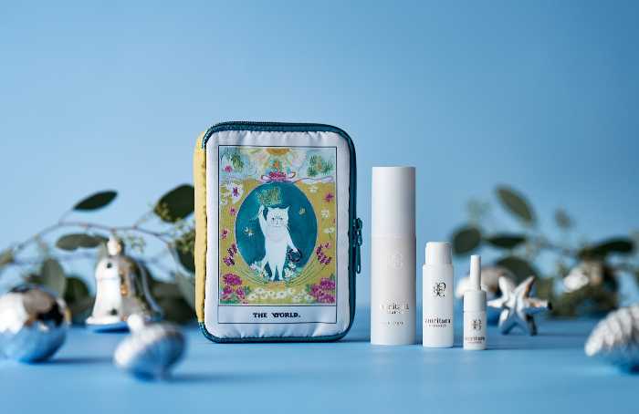 植物療法士であり、アーティストとしても活躍する早坂香須子さんとの特別なコラボレーションが、アムリターラから今年のコフレとして登場。タロットカードをモチーフに描き下ろされた猫のアートが映えるポーチは、海洋プラスチックをアップサイクルしたサステナブル素材。そこに「オーガニック×エイジングケア*」を叶える化粧水・美容液・クリームを詰め込んだ、心と肌を満たすスペシャルセットです。