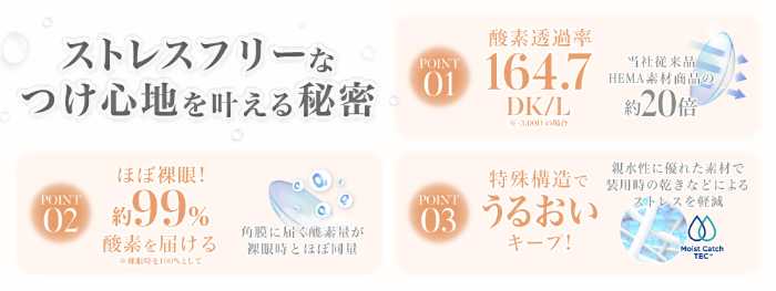 高い酸素透過率を誇るシリコーンハイドロゲル素材を採用し、従来のHEMA素材と比べて約20倍の酸素を瞳へ届けます。