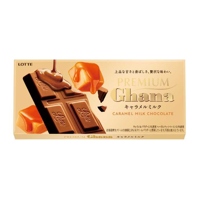 新作『プレミアムガーナ キャラメルミルク』は、焦がしミルクを使用したミルクチョコにコク深いキャラメルと北海道産生クリームを加えたクリームパウダーをブレンド。