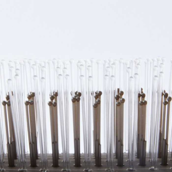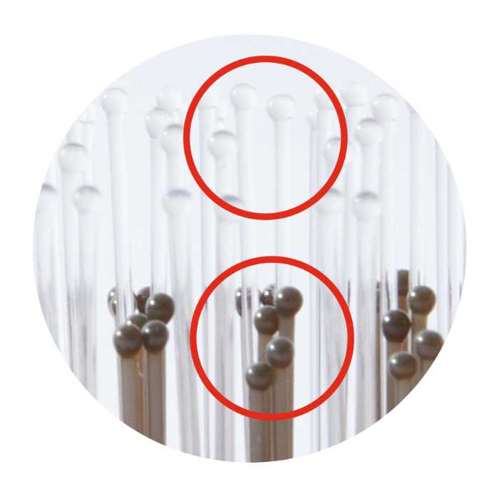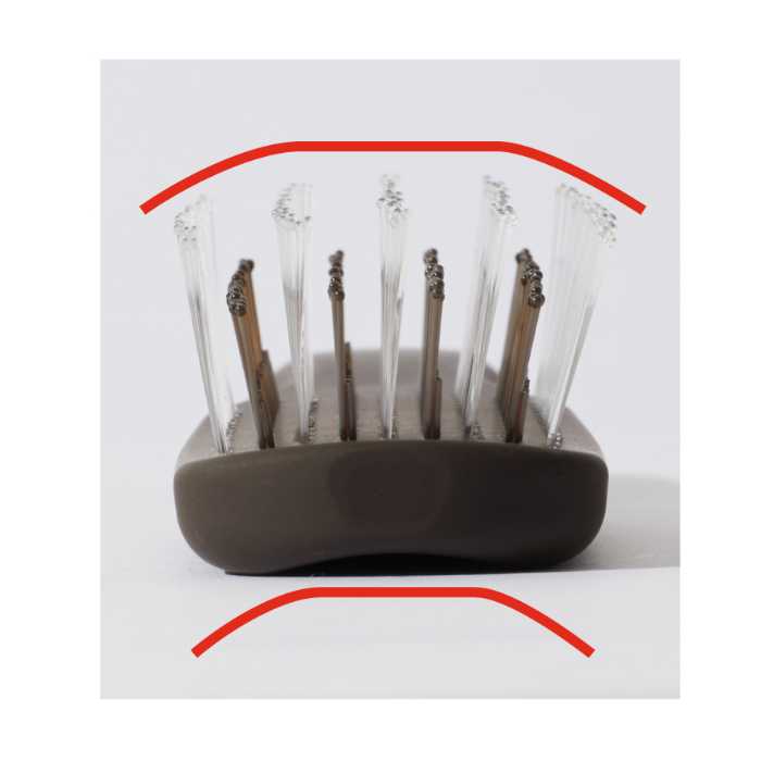 山形に整えられたピンが頭皮に押し当てられると、ほどよくしなり、ブラシ全体が均一にフィット。