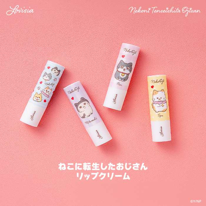 「Lovisia ねこに転生したおじさん リップクリーム」は、プンちゃん、てぷちゃん、みたらしちゃん、そして集合デザインの全4種類。