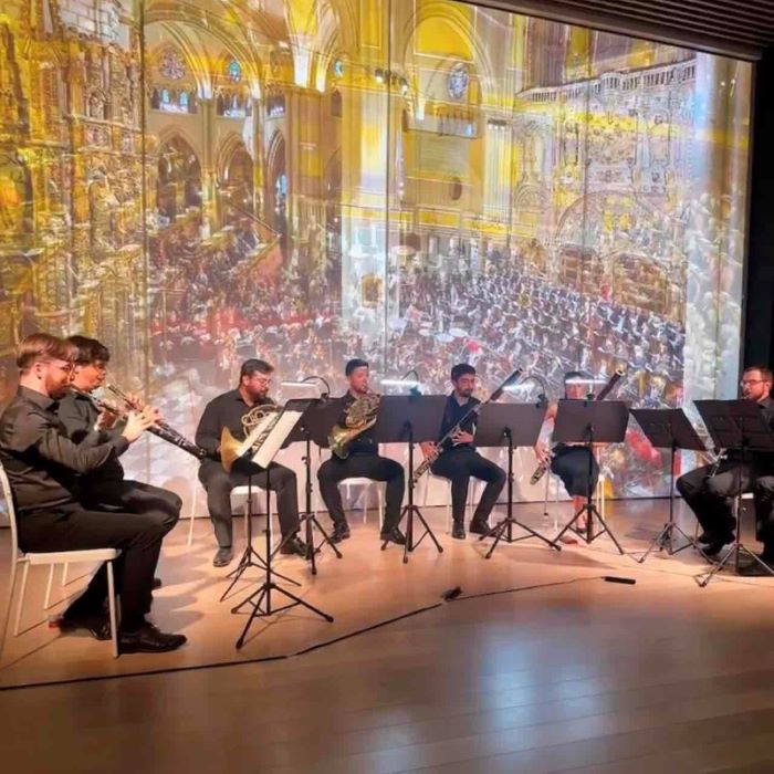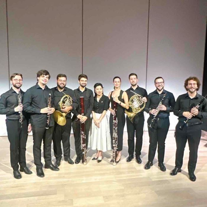公演を終えたルイジ・チェルビーニ青少年オーケストラの木管八重奏団のメンバーとともに記念撮影が行われました。オーボエ、クラリネット、ファゴット、ホルンを担当する奏者たちが笑顔で並び、舞台の余韻を漂わせる和やかな雰囲気に包まれています。音楽と人との交流が響き合う特別な一瞬を切り取った写真となりました。