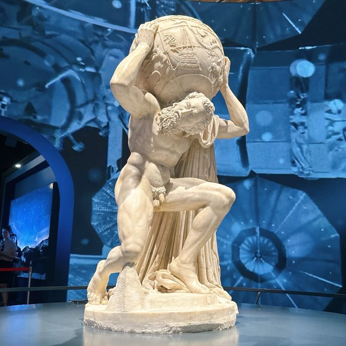 巨人アトラスが天球を背負う姿を刻んだ古代ローマの大理石像(2世紀後半)。天球には40以上の星座が描かれ、現存する最古級の天球儀として知られています。神話と科学が融合したこの像は、古代の宇宙観を今に伝える貴重な遺産です。ナポリ国立考古学博物館所蔵。
