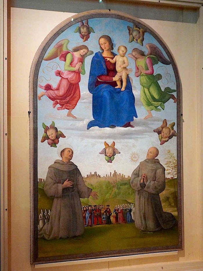 ルネサンスの巨匠ペルジーノによる「正義の旗」(1496年)。聖母子と天使たちが描かれた上段と、修道士や市民、背景に広がるペルージャの街並みが印象的です。本作は宗教行列のために制作され、信仰と秩序を象徴する名品。イタリア国外では初公開。ウンブリア国立美術館所蔵。