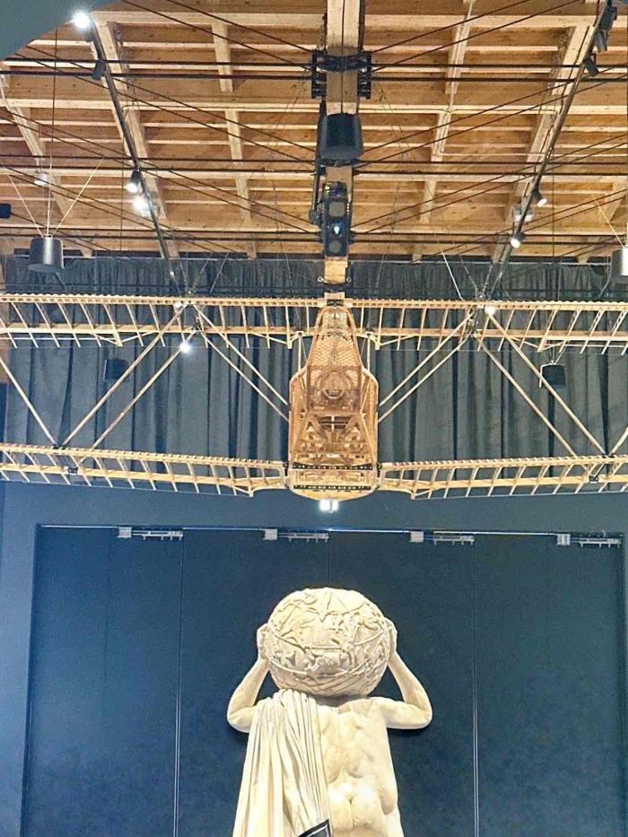 古代神話の力強さを体現するファルネーゼのアトラス像。その頭上には、レオナルド・ダ・ヴィンチが構想した空飛ぶ機械の模型が展示されています。古代からルネサンスへと連なる叡智が同じ空間で呼応し、来場者に時代を超えたイタリアの精神を体感させます。